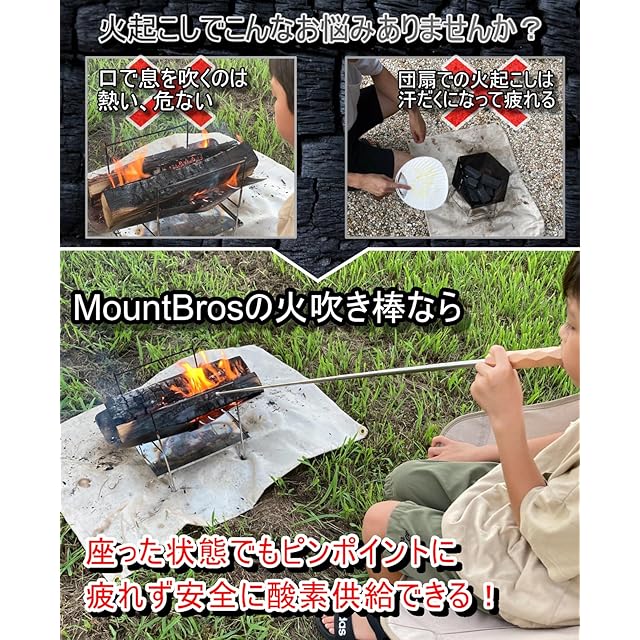 【キャンプのプロが推薦】MountBrosから火吹き棒が販売開始しました。「日本キャンプ協会公認インストラクター」、「JBS認定ブッシュクラフトインストラクター」2つの資格を保有しているプロキャンパーに推薦していただきました。キャンプやバーベキューの火起こしの際にうちわのように疲れることなく、ピンポイントに効率的に酸素を供給できる必須のキャンプ用品です。