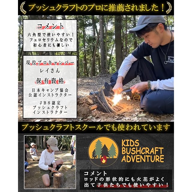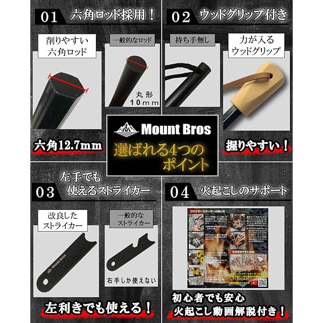 MountBrosの極太で長い六角ファイヤースターター(メタルマッチ)は圧倒的な着火力で大量の火花が出ます。ウッドグリップの持ち手付きで握りやすいため、力が入りやすく滑りにくいです。ヘキサ型(六角)で削りやすいので女性や子供でも簡単に着火できます。