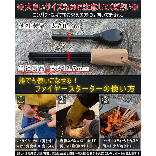 直径12,7mmの六角極太ロッドで、2万回近く削ることができます。ロッドは火花が出やすいようにオリジナルブレンドしたフェロセリウムロッド。