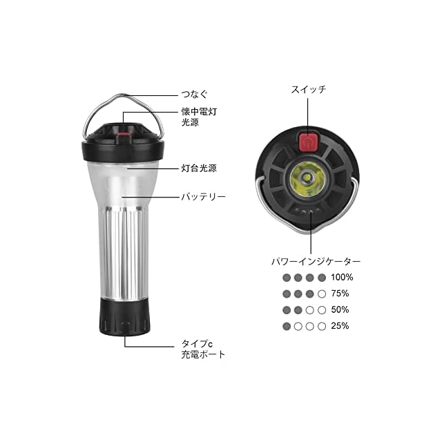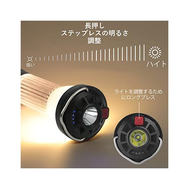 【3つの光源・4つ点灯モード・無段階調光】:LEDランタンが3つの光源:暖かい光/白い光/赤い光。4点灯モード:懐中電灯、白点滅モード、ランタン、赤SOS信号灯。LEDライトや懐中電灯モードでは、長押しで調光できる無段階輝度調整可能、周囲の環境に合わせて適切な光や雰囲気を作り出すことができます。 懐中電灯モードでは、ボタンをすばやく2回押して白点滅モードモードに入り。