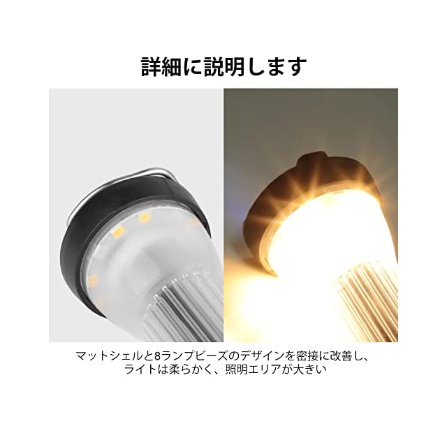 【 製品仕様】 :ledランタン 色:ブラック、材質:ABS+PC、IP45防水グレード、サイズ:Φ30*115mm、重量92g、電池容量:2600mAh 明るさ:14lm~200lm、色温度:6500k&3500k、充電:USB Type-C 点灯時間:7(ハイモード)~120H(最弱)、充電方法:USB Type-C 、付属品:ライト本体×2、ミニトライポッド×2、シェードx2。