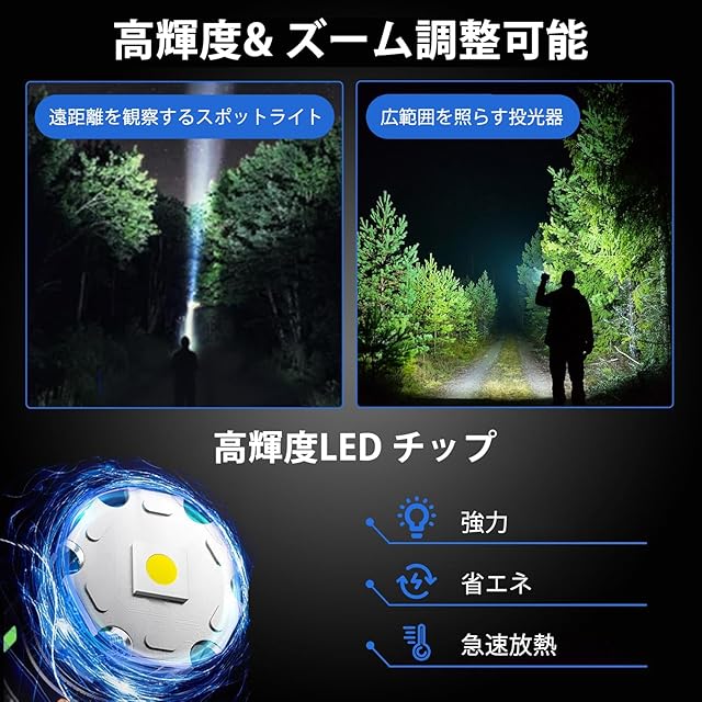 『超高輝度30000ルンメー 懐中電灯 led 強力 軍用 最強』フラッシュライトは高性能のLEDを採用し、最大輝度30000ルーメンの明るい光を放ち、最大照射距離は500メートルに達します。暗闇でも広範囲を明るく照らし出すことができます。この高品質のled懐中電灯はお買い得です。すべてのアイテムはギフトボックスに入っており、サイズは適切で、端にはハンドストラップが付いており、持ち運びに非常に便利です。 また、あなたの家族、パートナー、友人、同僚のための実用的な贈り物。