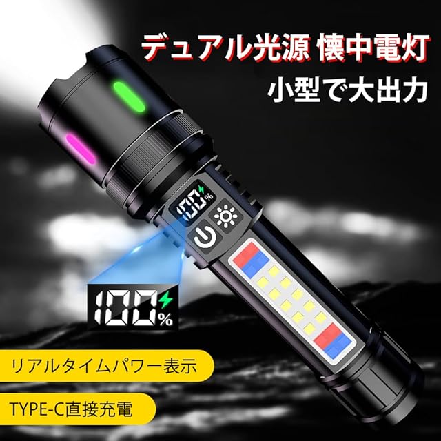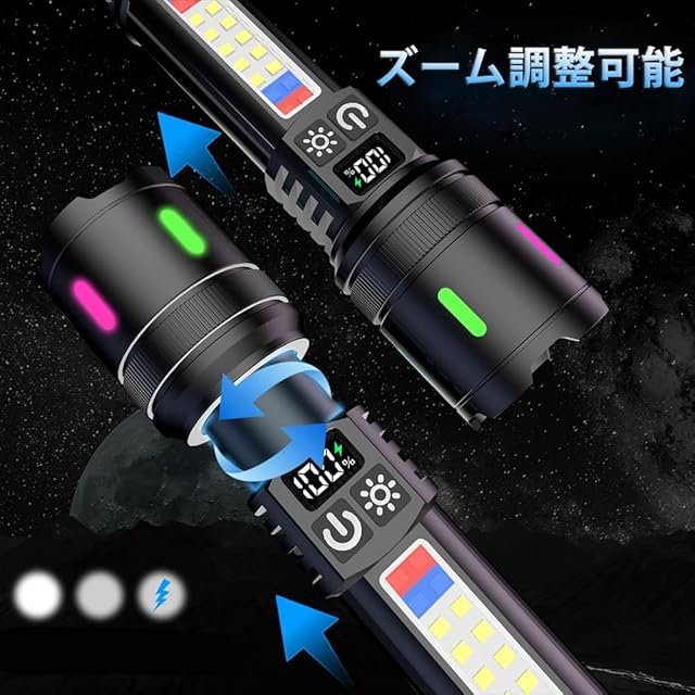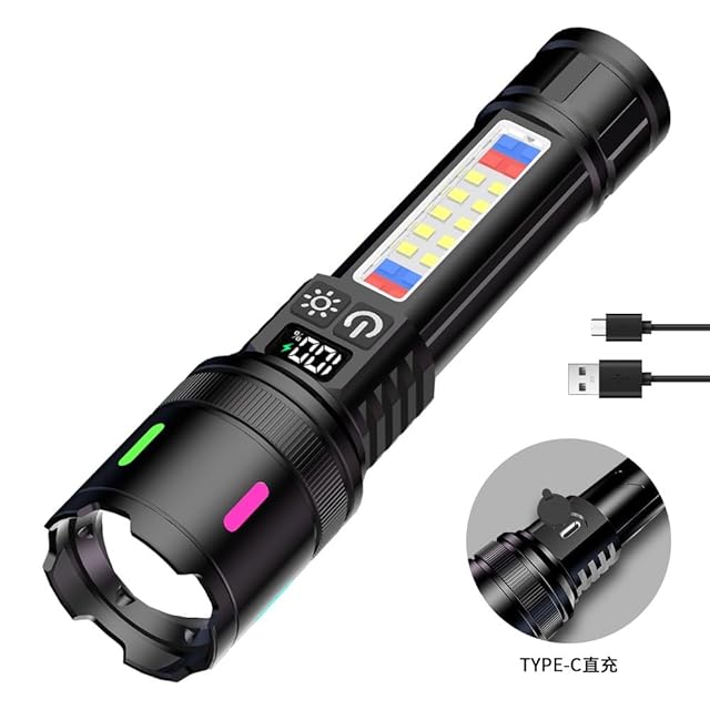 LED 懐中電灯 超高輝度20000ルーメン 超遠距離照射 充電式 軍用 最強 ハンディライト ディジタル電気量 明るい 超強力 フラッシュライト 7モード ズーム調整 Type-C 電池式 ハンドライト 軽量 小型 多機能 赤青警告灯付きサイドライト COB 作業灯 防水 防災 手持ち 新型 携帯 登山 夜釣り用 キャンプ アウトドア 地震 停電対策(2個パック)