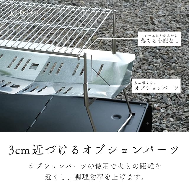 【 調理可能 】 オプションパーツ で約3cm炎との距離を近づけ、より高火力でお料理を堪能下さい!また、 焼き網 は五徳のように焚き火台の上部にセットするだけで、バーベキューや焼き肉をお楽しみいただけます。ワイヤータイプの 網 なので洗浄も簡単です.