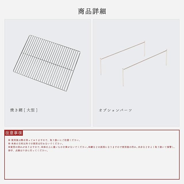 【高品質な素材】 焼き網 には 耐火性 に優れた ステンレス スチール( SUS304 )を採用しています。この素材は 耐火性 があり、長期間の使用に対応します。また、上部なつくりの為、何度でも繰り返してご愛用いただけます。