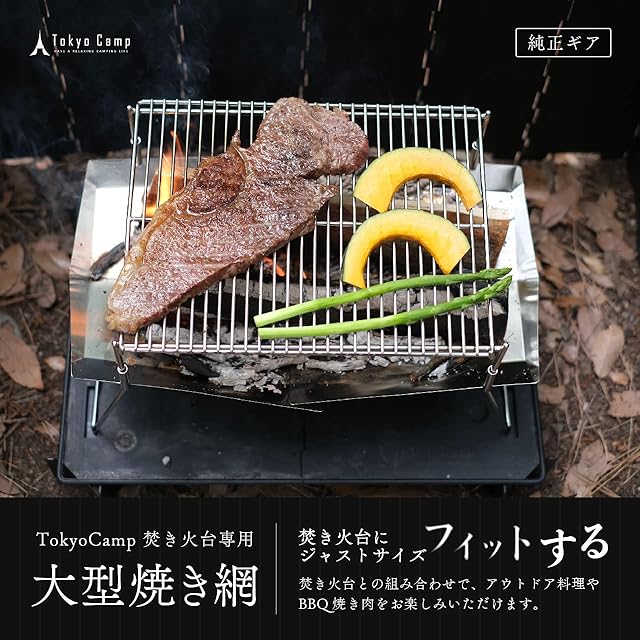 【 TokyoCamp 焚き火台 専用 大型 焼き網 】 TokyoCamp 焚き火台 の上部にセットするだけで、広い 調理 スペースを確保できる専用の大型 焼き網 です。 ソロキャンプ でも充実した 料理 体験を提供します。
