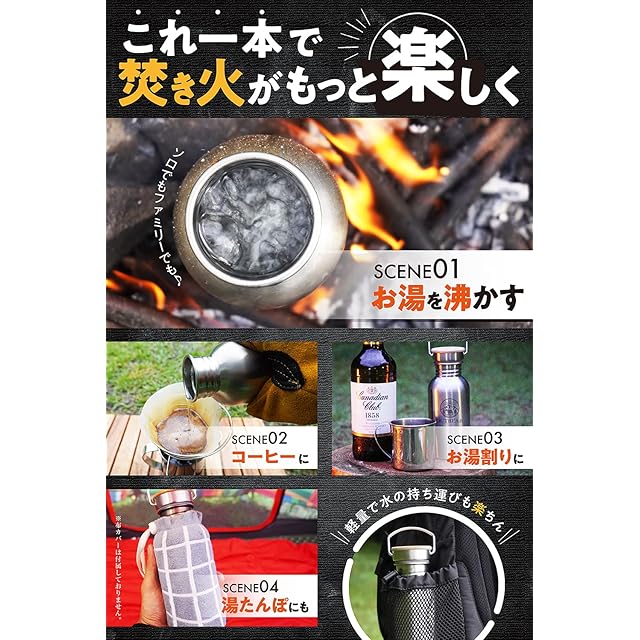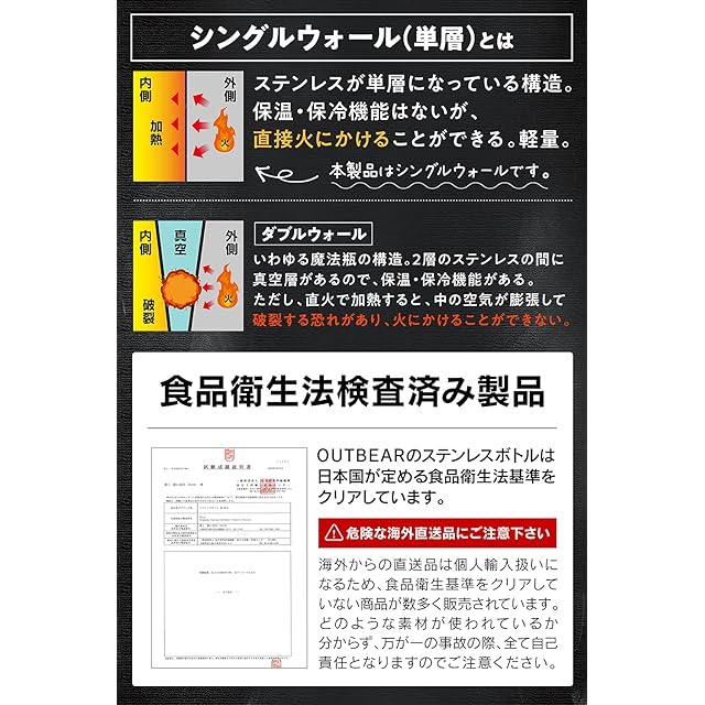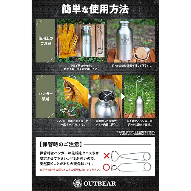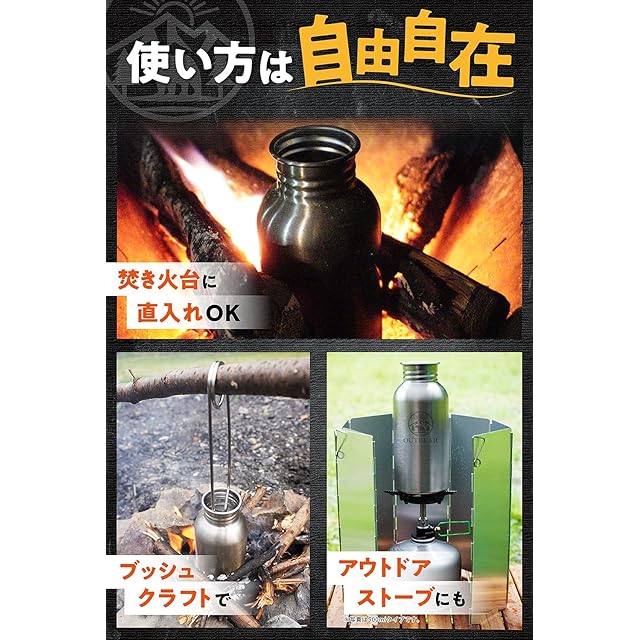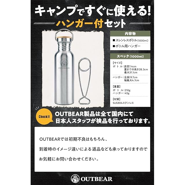 OUTBEAR【直火で使えるステンレスボトル】 直火 焚火 焚き火 湯たんぽ ボトルハンガー付(食品衛生法許可取得済) 1000ml