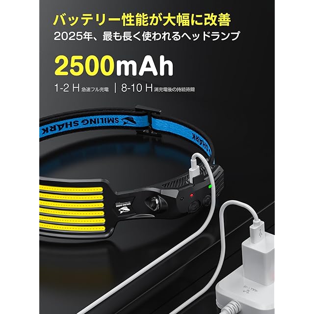 【超長時間連続使用】ヘッドランプは2500mAhのバッテリーで作動し、1回の充電で最大8時間の連続使用が可能。フル充電にかかる時間はわずか1~2時間です。