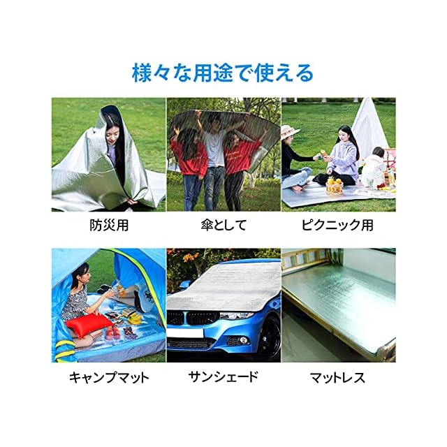 【多目的シート】普段はレジャーシート、キャンプシート、テントシート、寝袋のインナーシーツ、車中泊用マットレス、運動会用マットなどとして使用でき、急な気温変化や災害の時はエマージェンシーシート(保温シート)として使用可能な銀マットです。