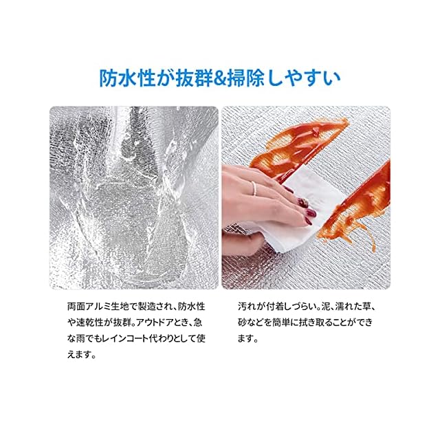 【3層の構造で湿気遮断、断熱と保温】中間層は発泡ポリエチレンで作られるので一層柔らかくなり、快適にご利用いただけます。両面にはアルミ蒸着が施されているため使用中は内側の熱が外部に放散せず、外部の湿気や冷気も遮られます。保温性、断熱性が抜群です。キャンピング時は、テント内で寝袋下にインナーシーツとしても、テントシートとしても使うことができ、体温が保たれるので快適に利用できよう。
