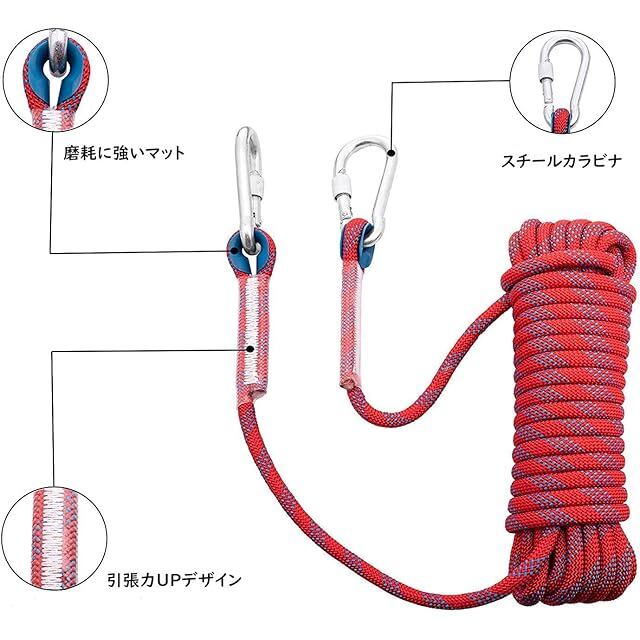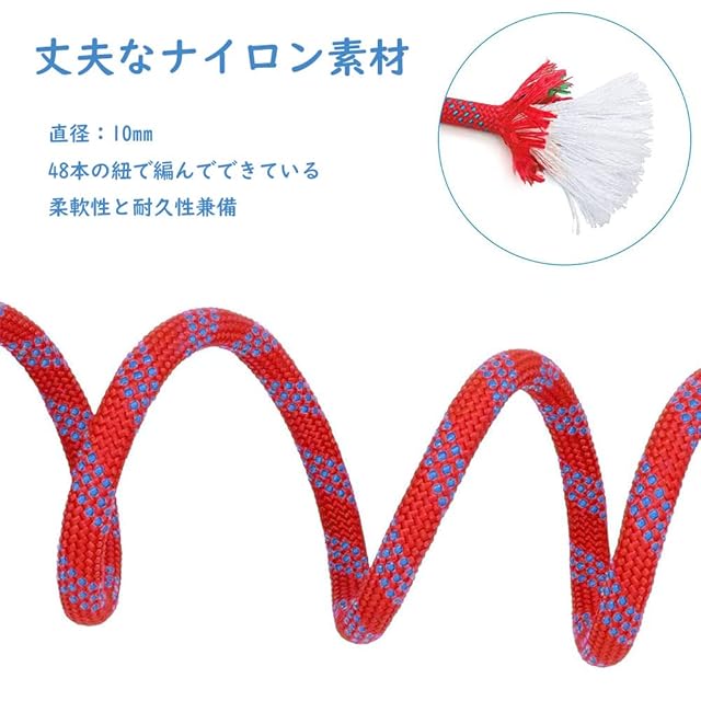 focous 多目的ロープ 10mm 10M/20M/30M 引張力2100kg 48本ナイロン芯 アウトドア キャンプ 樹木伐採 窓清掃 カラビナ2個付き (10M)