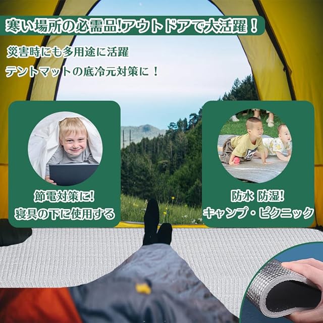 【アップグレード版素材】厚さ約8mm双面アルミニウム膜防潮マットは、両面アルミ膜の中の良質なパールコットンを採用しています。高品質のアルミホイルですので、防水防湿で、優れた断熱性と摩擦耐えの性能があり、引っ張っても割れない。