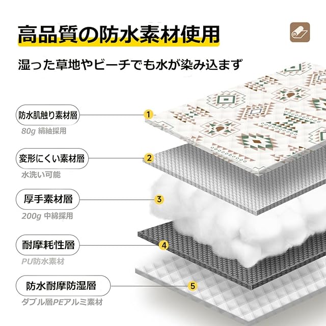 【5層構造】1.地面と接する裏面にアルミフィルムを使用しているため「防水性・断熱性・耐久性」に優れ、地面からの湿気や冷気をシャットアウトします。また、海水浴や川遊びで使う時に砂がくっつかずサラっと弾き返します。/2.真ん中に中綿が詰まっているため軽度のクッション性があります。3.表面はポリエステルのサラサラとした素材です。撥水加工を施しているため水分を弾いたり砂や草がくっつきにくいです。
