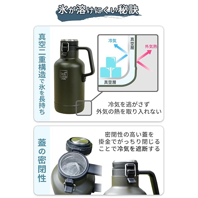 【氷長持ち】アウトドア用に開発したアイスジャグ。冷気を逃がさず外気の熱を取り入れない真空二層構造により、長時間の保冷ができます。暑い時期でも快適に過ごすためのキャンプギアです。