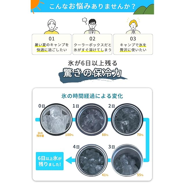 【驚きの保冷力】12時間毎に氷が全て溶けきるまでの経過を観察し3日以上氷が残ったことを確認しました。(直射日光の当たらない、室温24℃±2℃の環境で実験)