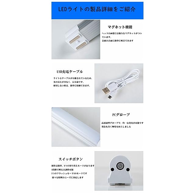 YOREMEI LEDライト USB充電式 マグネット付きキッチンライト LED ランプ 2200mah 作業灯 ワークナイトライト 5段階点灯 調光3段階 60W 超高輝度キャンプ アウトドア照明 ポータブル 防災 SOS点滅 非常灯 停電対策 夜釣り機械修理 防災対策 車中泊 散歩 読書 点検·メンテナンス 救難活動 屋外屋内照明(19cm/2200mah)