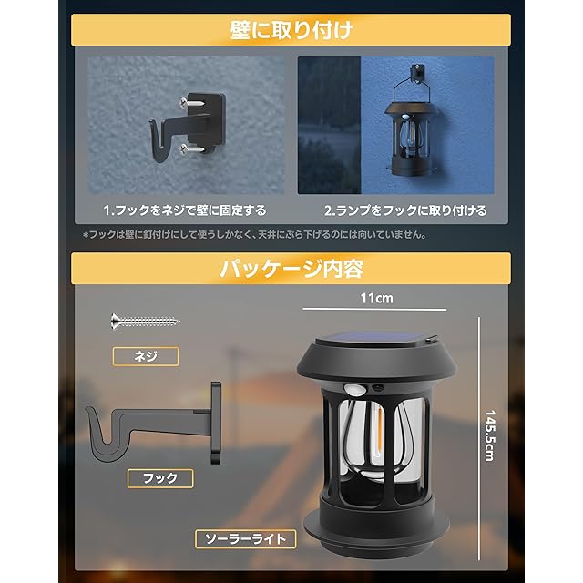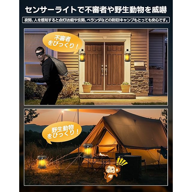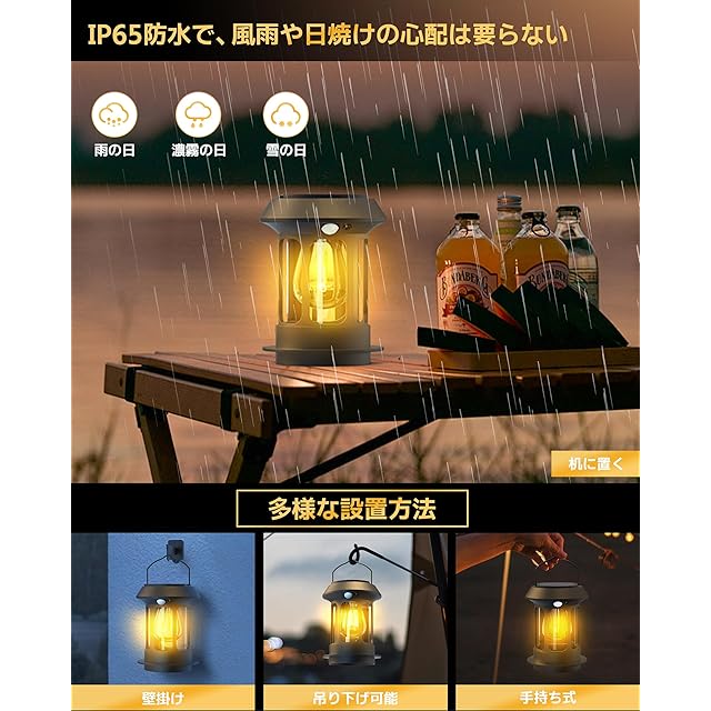 【過酷な環境でも安心 】IP65防水防塵仕様のソーラーランタンは、突然の雨や砂ぼこりにも強く、アウトドアの厳しい条件でも確実に作動。テント周りに設置すれば、不審な動きを光で威嚇する防犯ライトとしても機能します。キャンプだけでなく、庭先や災害時の非常用照明としても重宝します。