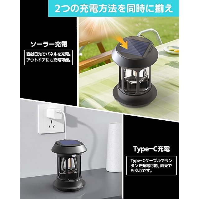【二重充電システムで電源切れを解消】環境に優しいランタンでありながら、USB充電にも対応。晴れた日はソーラーパネルで自動充電、曇りや夜間はUSBケーブルでサッと充電可能。充電式LEDランタンとして、アウトドアでも日常生活でも、電力不足の心配がありません。