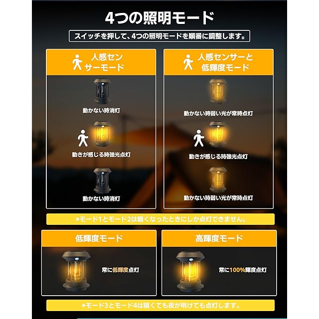 【4モード でどんなシーンにも対応】この 充電式ランタンは、状況に応じて光の使い分けが可能: 1. セキュリティモード(人や動きを感知して自動点灯→30秒後に消灯)。2.省エネモード(低消費電力で待機→人を感知するとフル点灯)。3.常夜灯モード(50%の明るさで穏やかに照明)。4.フルパワーモード(最大輝度で広範囲を照らす)。夜間のキャンプサイトや防災時にも便利な、多機能LEDランタンです。