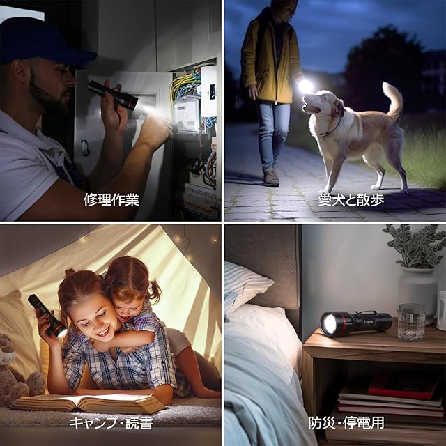 【便利なズーム式・5種類の点灯モード】この懐中電灯には、伸縮式のフォーカスレンズが搭載されており、ヘッド部分を引っ張ることで光の焦点距離や照射範囲を調整することができます。これまで夜間の安全性を気にしていた方におすすめです。さらに、ハイ、ミドル、ロー、フラッシュ、SOSの5つの点灯モードを搭載しています。用途に応じてモードを変えられるので、とても便利です。(スイッチボタンを半押ししてモードが切り替わります。スイッチボタンを全押しして懐中電灯が消灯します。)