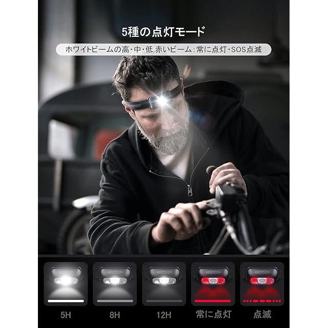 【5種の点灯モードと記憶機能】へっどらいとは5種の点灯モードを提供:ホワイトビームの高・中・低;赤いビーム:常に点灯;緊急用のSOS点滅。前回の点灯モードを自動的に記憶して、毎回点灯モードを選択の面倒を除く。特定の点灯モードに4秒以上止まったら選択は承認します、その時多機能ボタンを押すと電源オフできます