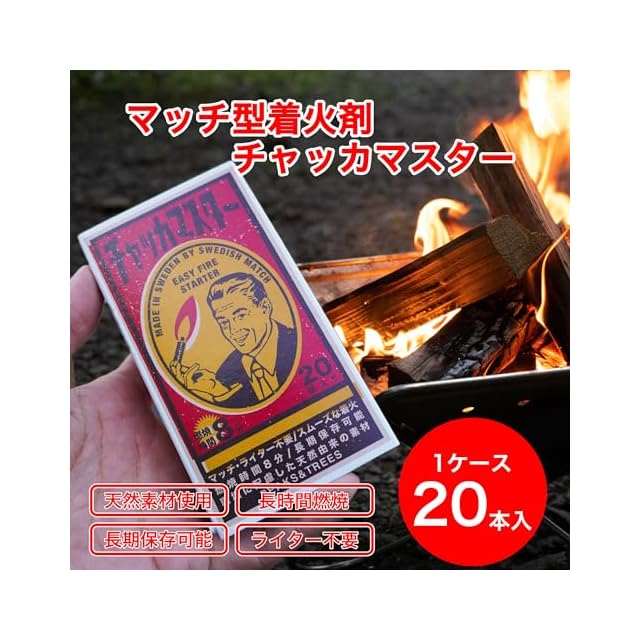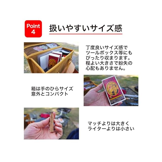 【道具不要!簡単火おこしが可能】マッチやライター、バーナーなどの道具は不要!マッチと同じ要領で中身の着火剤を箱に擦って火を点けることが可能です♪キャンプ初心者にもおすすめのアイテムです!