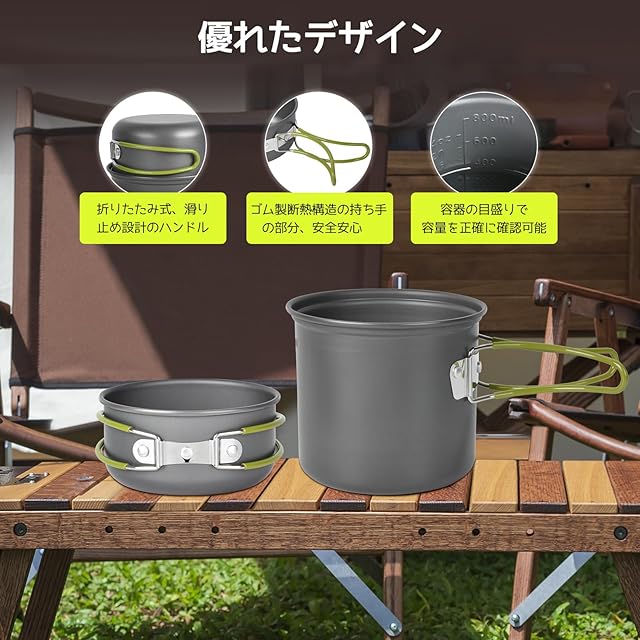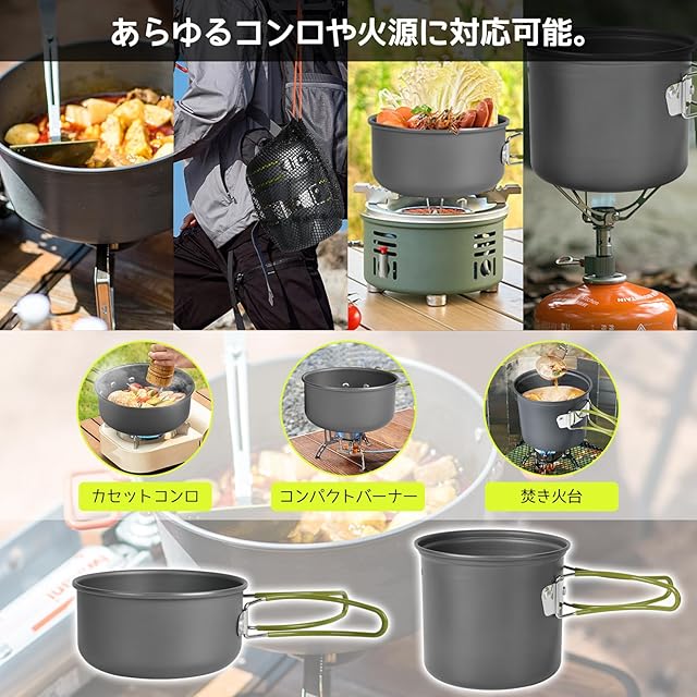 【携带便利・コンパクト】クッカーセットは、複数の調理器具を一つにまとめてコンパクトに収納することができます。折り畳みハンドル、超軽量、超コンパクト、メッシュ収納袋を付き、持ち運びに便利です。【清浄簡単】鍋はノンスティック加工を施しており、拭き取るだけで汚れや焦げ付きを落としやすいです。耐高温、清浄簡単、旅行に非常に良いです。