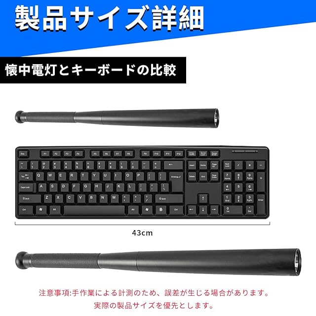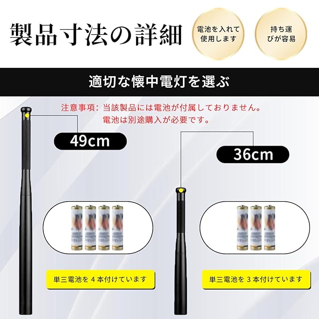 【商品仕様】野球バット懐中電灯本体 ×1。材質:アルミニウム合金。全長:49cm。単三電池 4本で駆動( 当該製品には電池が付属しておりません)