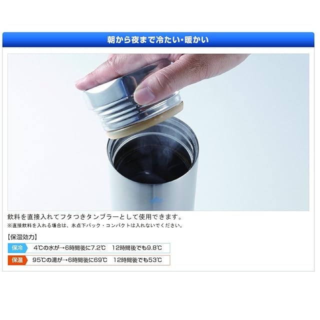 ※保冷(保温)効力とは、室温20℃において製品に規定量の4℃の冷水(95℃の熱湯)を満たし、所定時間放置した場合の温度です。