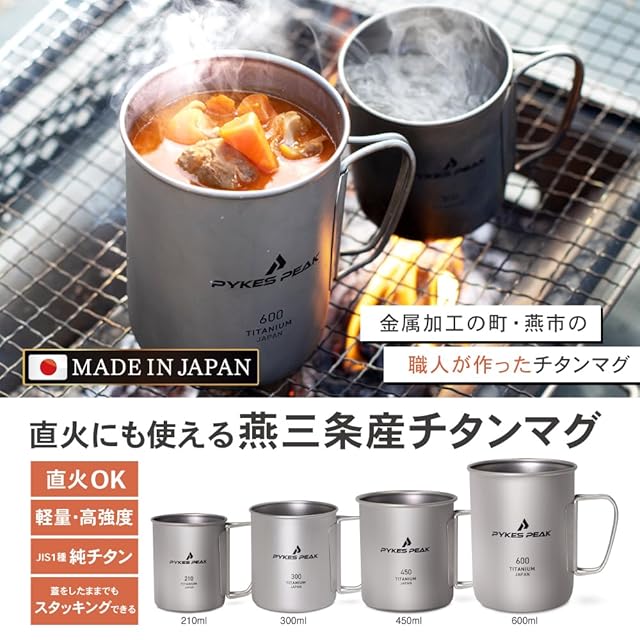 ✅【高品質の燕三条日本製チタンマグ!】キャンプでも多く利用されているチタンマグは、「強度・軽さ・錆びに強い」というチタンの性質から、キャンプなどのアウトドアシーンで大活躍してくれる人気アイテムのひとつです!品質のいい日本製にこだわり、新潟県の金属加工の街「燕市の燕三条」を使用した高級感・質感ともにおすすめなPYKES PEAK ( パイクスピーク ) ブランドのチタンマグです!焚き火などでの直火での使用も想定して設計されております。