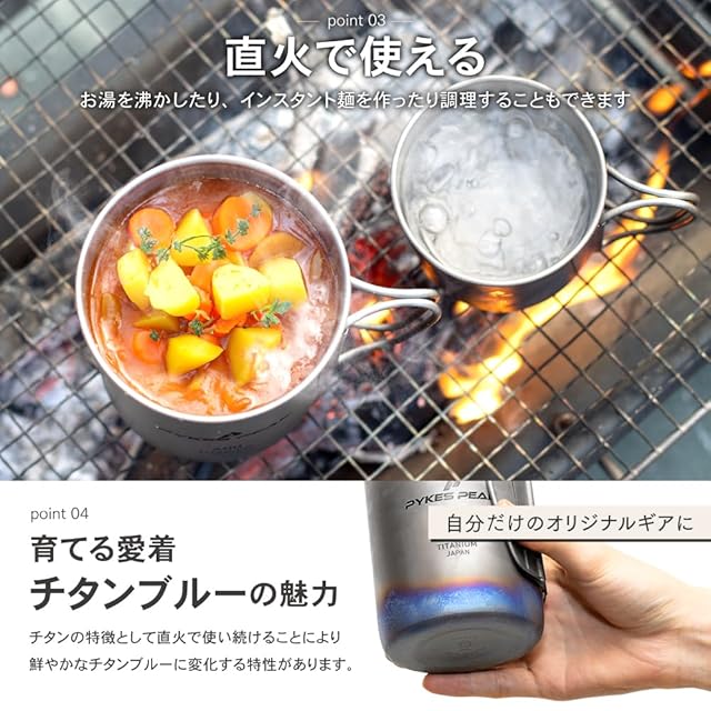 ✅【嫌な金属臭がしない】金属食器は使用されている素材によっては、独特の金属の臭いや味が出てしまうもの。PYKES PEAKのチタンマグは、金属の臭いや味も抑えられる純チタンが使用されています。美味しい飲み物・食べ物を美味しいままに楽しめます。飲み物だけでなく、クッカーとしても使用できます!