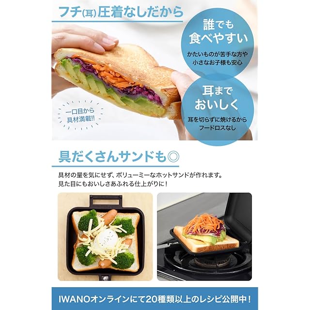 ✅【 サ ク サ ク ふ っ く ら で パ ン 耳 ま で 美 味 し い 】パン耳を圧着せず、耳ごと焼けるタイプなのでパン耳本来の食感を残し、外はサクサク、中はしっとり食感を最後まで楽しめます。パンの耳がカリカリになるのが苦手という方にもオススメ。ふんわりした耳の食感とサックリ焼いたサクサクの食感の絶妙なハーモニーは、「最高に美味しい」のひとこと。耳の圧着なしで、パン耳ギリギリのところまで具材を挟めるから、最初の一口から最後の一口まで具がたっぷり幸せ気分に。ボリュームがあり写真映えするホットサンドができます。朝食で栄養たっぷりなホットサンド 、おやつにスイーツホットサンドなどいろいろなホットサンドを楽しめます。