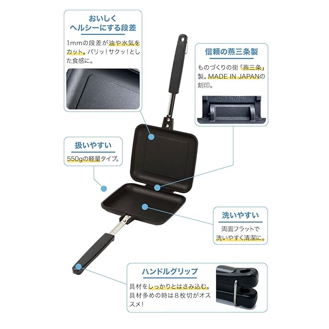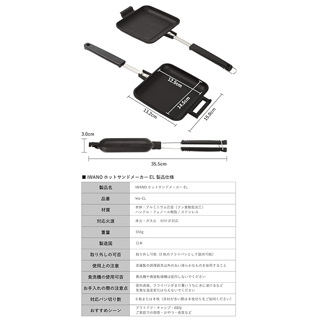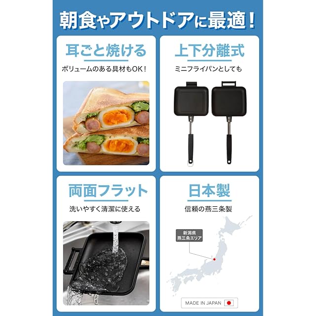 【 IWANO × 燕三条 】 日本製 直火式 ホットサンドメーカーEL 両面フラット パン耳圧着なし 2枚のフライパンとしても使用可能 PFOSフリー PFOAフリー 耳カリふわの食感 上下取り外し可能 フッ素樹脂加工 パン耳まで柔らかい ホットサンドメーカー 直火 対応 ホットサンド アウトドア キャンプ にも 丸洗いOK MADE IN JAPAN