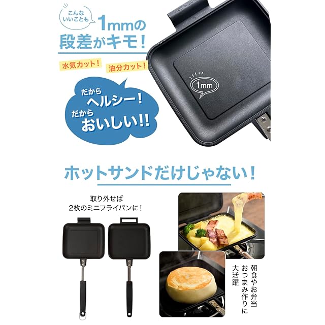 ✅【 セ パ レ ー ト で 両 面 フ ラ ッ ト 、 ど ん な 料 理 も 手 軽 に 】セパレート(上下分離)出来るので1枚ずつコンロに置いて2枚のミニフライパンとしても使用できます。ちょっとした炒め物なら1枚だけを使いサッと簡単に。忙しい朝には片方でソーセージ、もう片方で目玉焼きを作るなど、同時に2品作れて時短料理にもぴったり。大きなフライパンを使用せず手軽にサッと使えるのもおすすめポイントです。ホットサンド だけでなく、炒め料理も使えて何役もこなすので、荷物を減らしたいキャンプでも大活躍します。