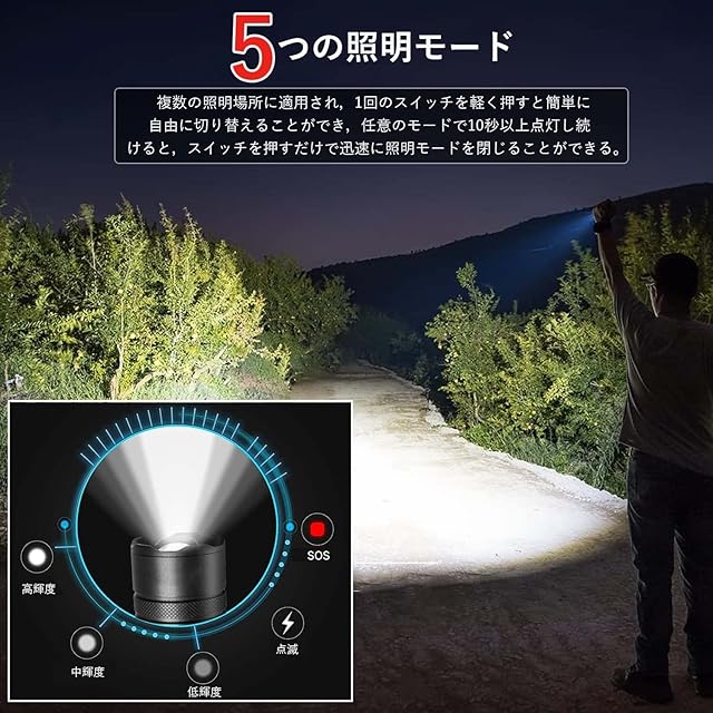 【5つの照明モード&3秒長く押すと闭じる&伸縮式フォーカス】3秒長く押すと閉じます。スイッチをタッチすると、高輝度-中輝度-弱輝度-点滅-SOS-消灯がすばやく切り替わります。懐中電灯をオフにする面倒な作業を避るために、どんなモードでも、照明時間は10秒を超えると、 スイッチを一度押すだけで、ライトをすばやくオフにできます。 5つの照明モードがあります。 最大13000メートルの強力な光線を投射でき、フラッドライトは道路を180度照らします。 大面積照明に適用です。 さまざまな目的に応じて、明るさモードと照明の焦点距離の範囲を調整できます。防災、キャンプ、登山、夜釣り、夜間照明、停電、地震対策、屋外ledライト、その他の照明および家庭での使用に広く使用されています。