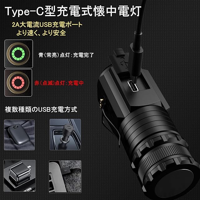 【注意】(端面導電なので、ヘッド、後ろカーは必ずきつくしてください。きつくしない場合は懐中電灯は点灯できない/正常に充電できないかもしれません!)本製品は高輝度を長い時間点灯すると熱を持つ場合がございますが、発火や爆発の危険はありませんので安心してご使用ください。パッケージの内容:LED懐中電灯*1(本体材質:アルミニウム)、18350充電式リチウム電池*1、Type-C充電ケーブル*1。