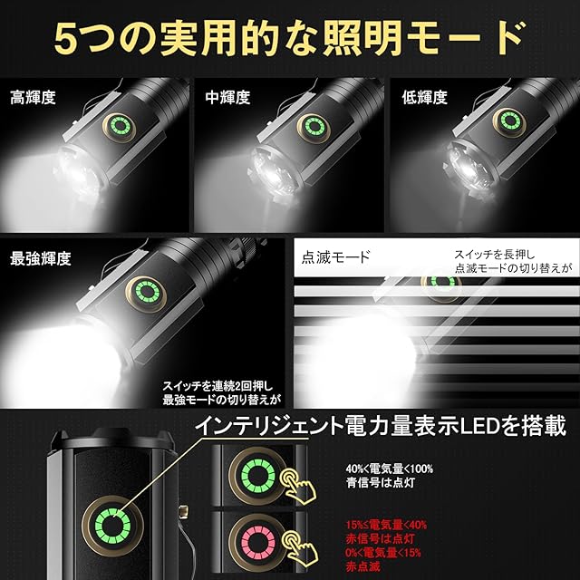 【5つの実用的な照明モード、見事な照明効果】高性能LED懐中電灯、寿命150000時間。明るさは5段階で調整できます:日常使用モードは高輝度-中輝度-低輝度+2つの緊急使用モード最強輝度-点滅五種類モードがあります。スイッチを長押しすると、隠し点滅モードがオンになります、ボタンをダブルクリックすると、最強の光を隠すモードがオンになります。にストロボが使用され、悪意のある犬を怖がらせることができます. フラッシュ機能は、危険な瞬間に緊急救助と警告の役割を果たすこともできます。防犯用の最強モードもあります。 アウトドア、キャンプ、夜釣り、山登り、夜道の一人歩き、暗い駐車場など、さまざまな照明ニーズに対応できます。光が強すぎるので,人々はこの種のハイライトを直接見ることができないので、高ルーメンの下で人を照らさないでください。