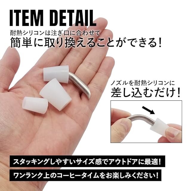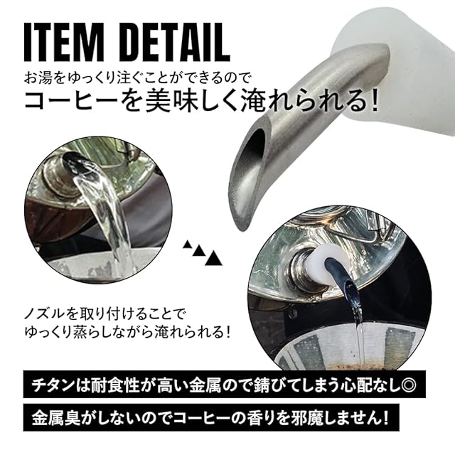 ✅軽量!頑丈!錆にも強いチタン製ケトルノズル。3サイズの耐熱シリコン付き。お手持ちのやかんの注ぎ口にドリップ用ノズルを刺し込むことでドリップケトルに!耐熱シリコンはヤカンの注ぎ口に合わせて使い分けることができる!ノズルを差し込むだけで簡単に交換することができます! ケトルの注ぎ口に装着するだけでお湯をゆっくり注ぐことができる。ゆっくり蒸らしながら注ぐことができるのでコーヒーを美味しく淹れられる!ワンランク上のコーヒータイムをお楽しみください!