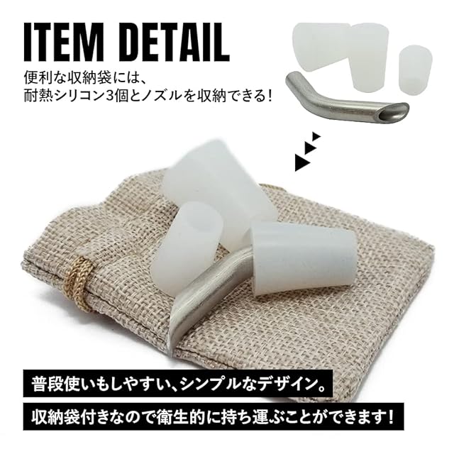 ✅【商品詳細】 ノズル ・全長(約):57mm ・重量(約):5g ・材質:チタン / 耐熱シリコン(Sサイズ) ・上径(約):14.5mm、下径(約):11mm、高さ(約):20mm ・重量(約):2g ・材質:シリコン / 耐熱シリコン(Mサイズ) ・上径(約):18.5mm、下径(約):14mm、高さ(約):25.5mm ・重量(約):5g ・材質:シリコン / 耐熱シリコン(Lサイズ) ・上径(約):22.5mm、下径(約):17mm、高さ(約):25.5mm ・重量(約):7g ・材質:シリコン 【セット内容】 ノズル、耐熱シリコン×3、収納袋
