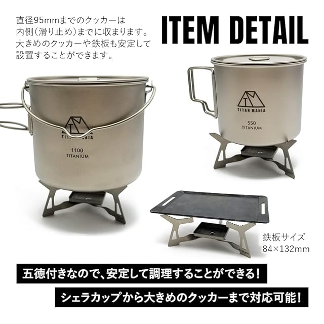 ✅足を広げて固形燃料を載せるだけですぐに使える!トレイに角型のエスビットの固形燃料を設置して使用できるのはもちろん、丸型の固形燃料でも対応可能!※丸型固形燃料(カエンニューエースE 20g/25g)を設置した場合はクッカー底面との距離が近くなります。 五徳付きなので、安定して調理することができる!シェラカップ、大きめのクッカー、鉄板も設置することが可能!直径95mmまでのクッカーは五徳の内側(滑り止め)までに収まります。