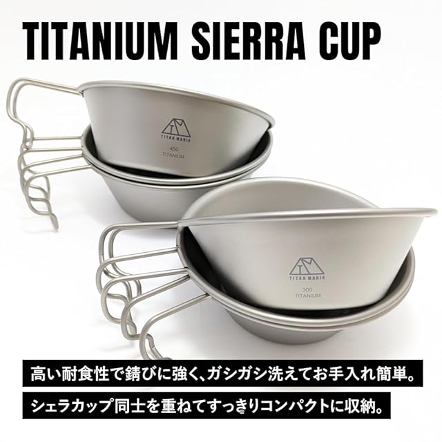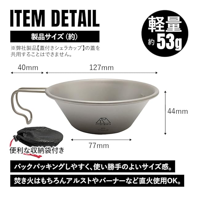 TITAN MANIA(チタンマニア) シェラカップ 300ml チタン製 ソロキャンプ クッカー コッヘル 超軽量 頑丈 直火 目盛り付き アウトドア キャンプ用品 収納袋付き