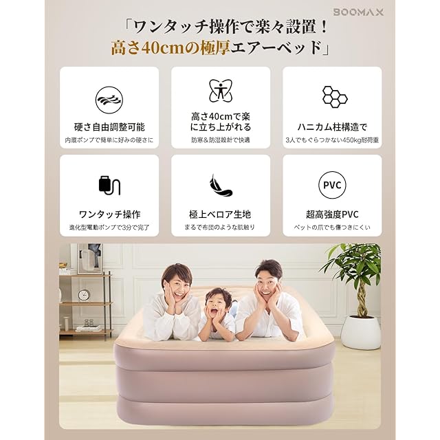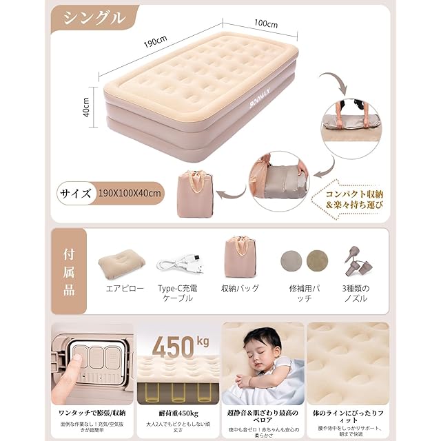 【2025年最新版・花見キャンプに大人気!】BOOMAX エアーベッド 2025年モデルが新登場!大容量4000mAhバッテリー搭載で、充電1回で4~6回使用可能。電動ポンプならワンタッチで簡単設置、たった2~3分でふかふかのベッドが完成!独自の空気調節システムで硬さも自由調整。Type-C充電対応の多機能ポンプ(弱光/強光/SOSライト付)で、災害時やキャンプでも大活躍。春のお花見から夏のキャンプまで、快適なアウトドアライフをサポートします!