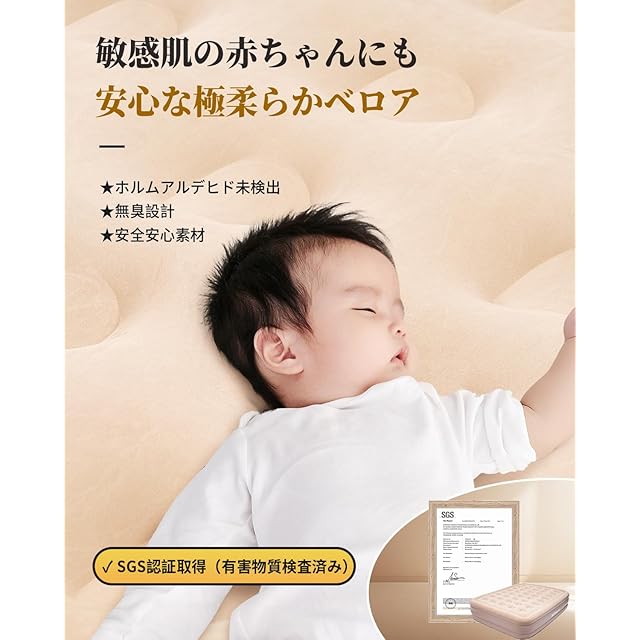 【25cmの厚さ·極上の眠り体験】BOOMAXのエアーマットレスは、まるで雲の上で眠るかのような贅沢な眠りを提供しています。25cmの厚みと柔らかなクッション性が体をしっかり支え、底つき感は一切ありません。革新的なハニカム構造は体圧を均等に分散し、包み込むような心地よさを実現。耐荷重200kgで安心してご利用いただけます。底面には強靱で耐摩耗性のPVC素材を使用し、滑り止めや優れた防水性があります。肌触りの良いベロア加工の表面は、夏は涼しく冬は暖かい感触を楽しめます。最高の眠りを体験し、至福のひとときをお楽しみください。