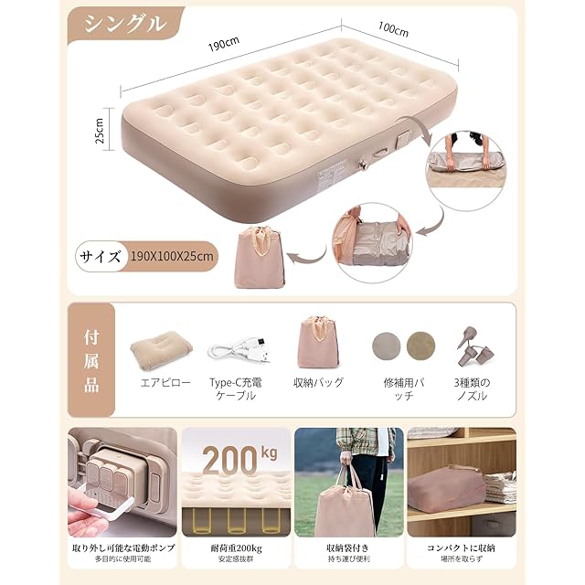 【コンパクト·持ち運び便利】来客用や車中泊、キャンプなど様々なシーンで大活躍!折りたたんで付属品も収納バッグにまとめられるから、持ち運びも便利。女性でも簡単に使える軽量設計で、クローゼットにしまったり、非常時に持ち出したりもラクラク。そして、約4kgの軽さで、移動も簡単。どんな場面でもお役立ちする便利なエアーベッドです!