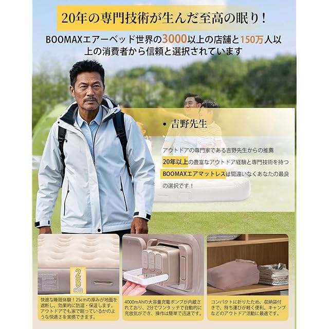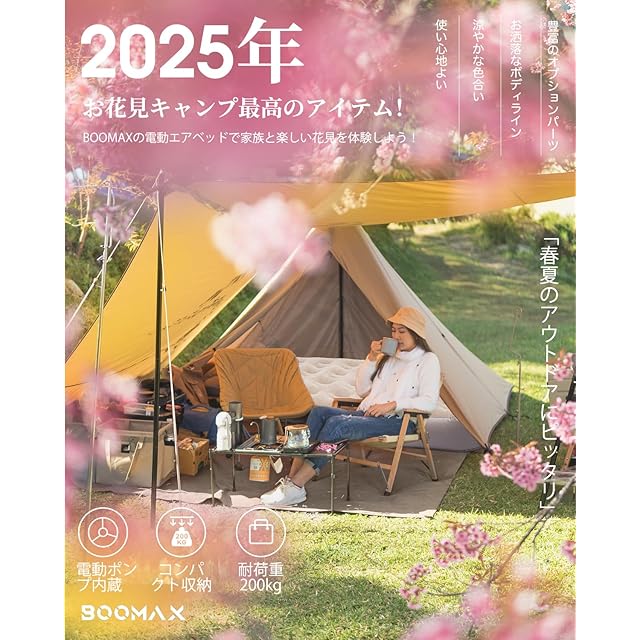 【2025春夏限定·お花見に最適!】BOOMAXの最新作、2025年アップグレード版エアーベッドが新たに登場いたしました。このアップグレードされたエアーベッドは、さらなる快適さを追求しています。最新のテクノロジーとデザインが融合し、2025年版は大容量の4000mAhバッテリーを搭載し、1度の充電で4〜6回の使用が可能です。電動ポンプを使用すると、ワンタッチで簡単に空気を入れたり抜いたりでき、わずか2〜3分で快適なベッドが完成します。さらに、独自の空気調節システムを備え、硬さや柔らかさを自由に調整できます。取り外し可能な電動ポンプにはType-C充電ポートやライト機能(弱光/強光/SOS)も搭載されており、キャンプでも活躍します。花見やアウトドアでのリラックスタイムに最適なこのアップグレード版エアーベッドは、2025年の春夏を彩る最高のパートナーとなること間違いありません。BOOMAXのエアーマットと共に、素敵な時間をお楽しみください!