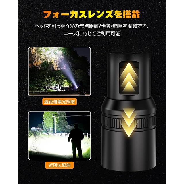 【焦点調整機能搭載・必要な場所をピンポイントで照射可能】懐中電灯使用中は、ハンドルとヘッド部を上下に伸ばして焦点を調整できます。光学レンズを選択し、焦点距離を変更することで、光束を広角から狭角まで調整可能です。最大300メートル先の対象にも焦点を合わせることができ、また180度の広範囲を照らすことも可能です。夜間の散歩やアウトドア活動、防災、キャンプなどに最適です