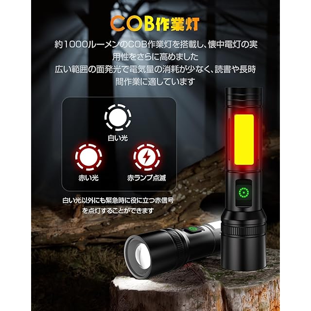 商品名:懐中電灯 小型 強力【2025年新機種・超高輝度・6点灯モード】ハンディライト 軍用【XHP160チップ・IPX6防水・COB作業灯】 ズーム式 Type-C充電式 大容量電池 フラッシュライト 高級合金素材 耐衝撃3M ハンドライト 軽量 ledライト 高輝度 防災 キャンプ 登山 夜釣り ウォーキング アウトドア 緊急用 作業用 地震 停電 避難対策