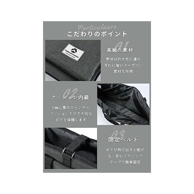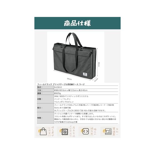 重量:約0.65kg; 収納能力:キャンピングムーン社製フィールドメッシュラック5台まで収納可能。IGTブリッジフレーム、ブリッジテーブル4台を天板とまとめて収納できます。