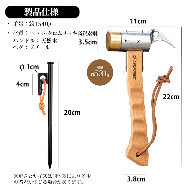 商品名:AVOFOREST ペグハンマー + ペグ20CM 10本付き ペグハンマーセット キャンプペグ 反射材入りロープ付き 高炭素鋼製 ペグ打ち 抜き 真鍮製ヘッド 木製ハンドル 収納袋付き 設営工具 テント キャンプ用品