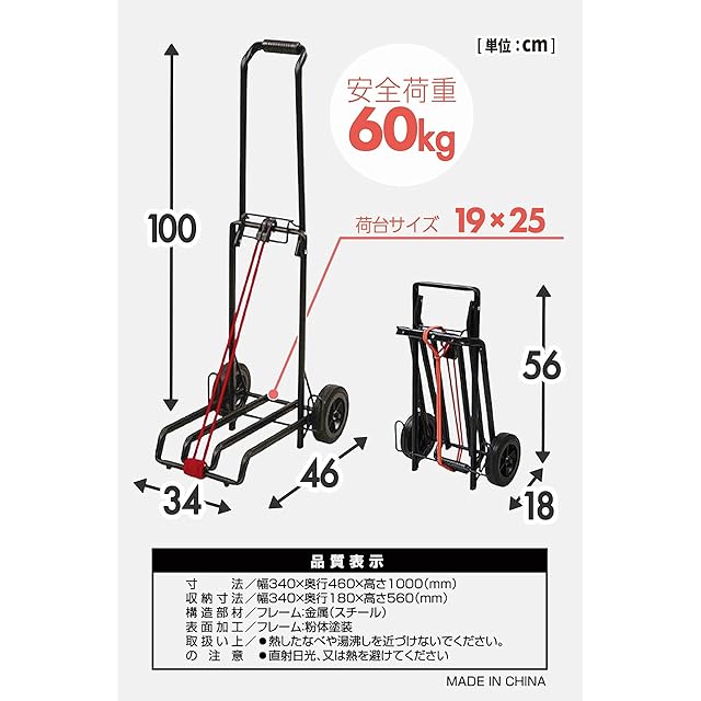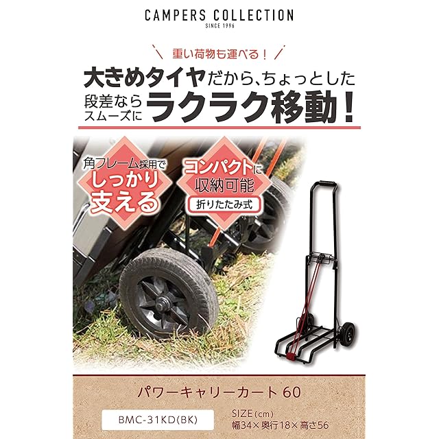 商品名:[キャンパーズコレクション 山善] キャリーカート ショッピングカート 台車 大きめタイヤ 耐荷重60kg 折りたたみ式 コンパクト ブラック パワーキャリーカート60 BMC-31KD(BK)